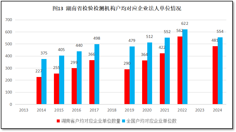 由图13可见,12年来,湖南省检验检测机构户均对应的企业法人单位数量逐年增加,但一直比全国平均数低。2024年湖南省检验检测机构户均对应企业法人单位481个,比全国平均数554个低了73个,说明单就企业法人单位数量这一潜在的检验检测客户而言,湖南省检验检测行业的状况并不乐观。以2024年度的统计数据计,湖南地区企业法人单位数量超过85.8万个,位居全国第12位,排名居于全国中等偏上,与湖南省检验检测机构数量在全国的排名比较接近。这说明,对于湖南省的企业法人单位数量来说,湖南地区检验检测机构存量显得略多,但匹配性尚可。近两年湖南省检验检测机构数量停止增长,可以进一步改善检验检测机构数量与企业法人单位数量的匹配关系,提升湖南省检验检测市场的发展质量。